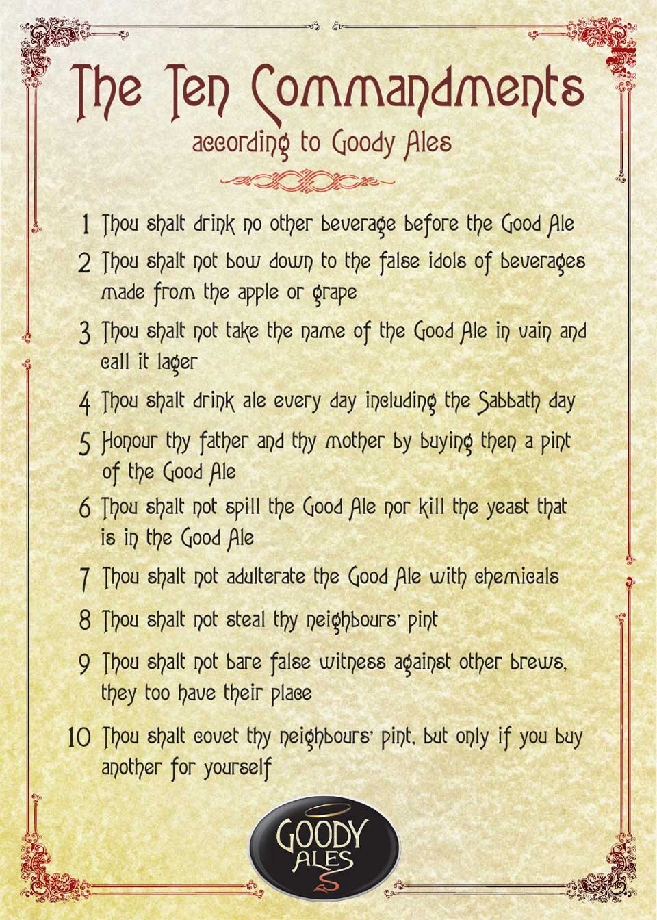 The Ten Commandments According to Goody Ales 594 x 420 mm (23.4 x 16.5 in). High quality print on 250gsm paper and matt laminated. £10.00 each. |